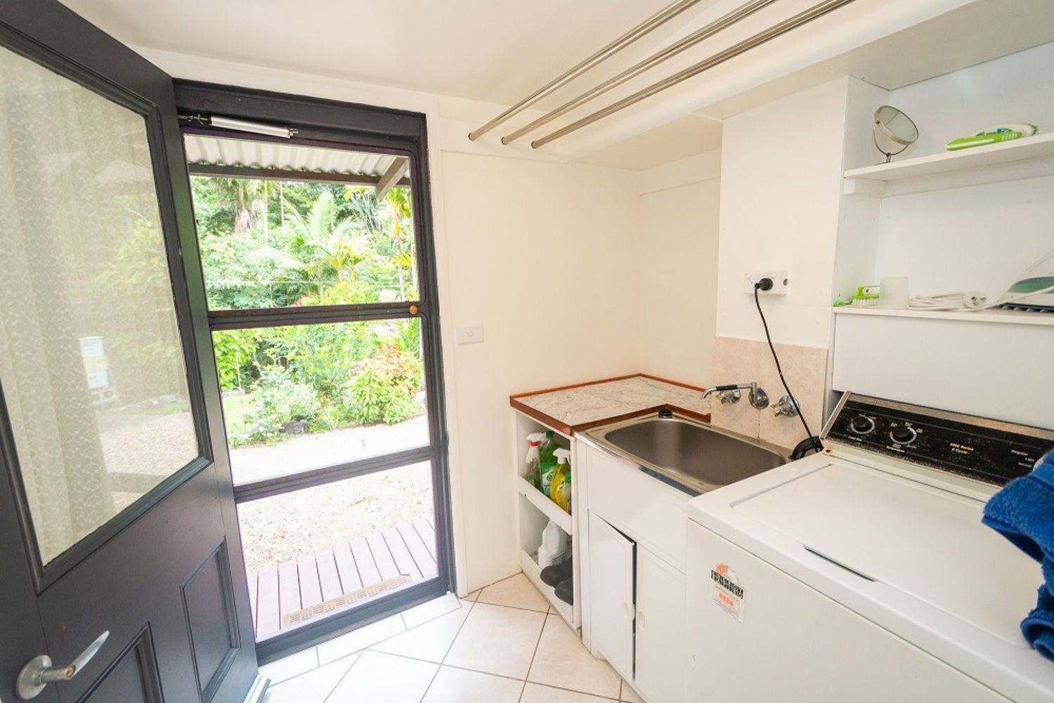 A door leads from the laundry to an outdoor patio area.